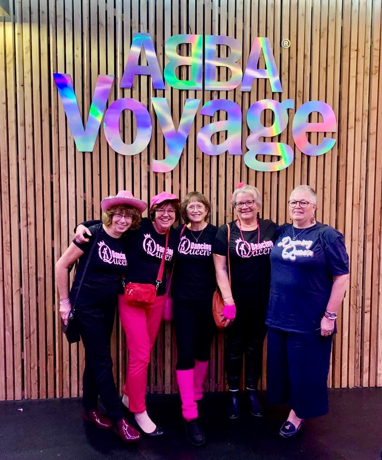 I have just returned from the UK where I visited my dear Dad and the fantastic Abba Voyage show in London – an amazing digital show of light and technology where you think you are seeing Abba but of course you‘re not … well worth a visit! And of course we all got dressed up as you can see in the photo …