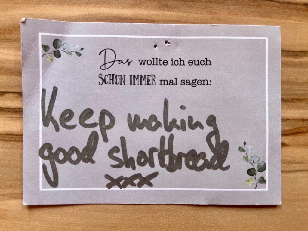 Now by a mixer, I mean a stand-alone appliance so you can just leave it to mix by itself. I now know a German ‘mixer’ is generally a blender for making smoothies, so a bit of a false friend. My Mum used to have a Kenwood – in fact I think my Dad still uses it! Mine wasn’t so fancy but I was still devastated when it came to a crashing halt in the middle of the mixing process and refused to move. As I needed the shortbread for a meeting where I had promised to make my famous shortbread, I had to knead it by hand (good homophone there!) … not a good day …